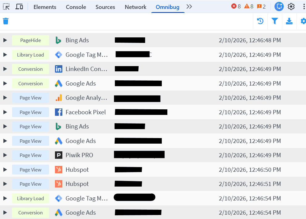 Omnibug is a powerful tool for inspecting analytics and marketing tags at the network level. It decodes requests from platforms such as Adobe Analytics, GA4, Meta, TikTok, and others, presenting payloads in a human-readable format.