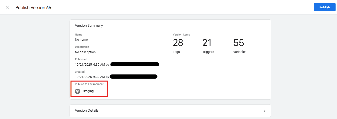 Start using the Environment: Once you confirm the creation, a new screen will appear asking you to “Publish to [environment_name]”. At this point, what GTM wants is to check with you which version you want to push to that Environment. Here, GTM will also give you two ways of using the environment you just created:
