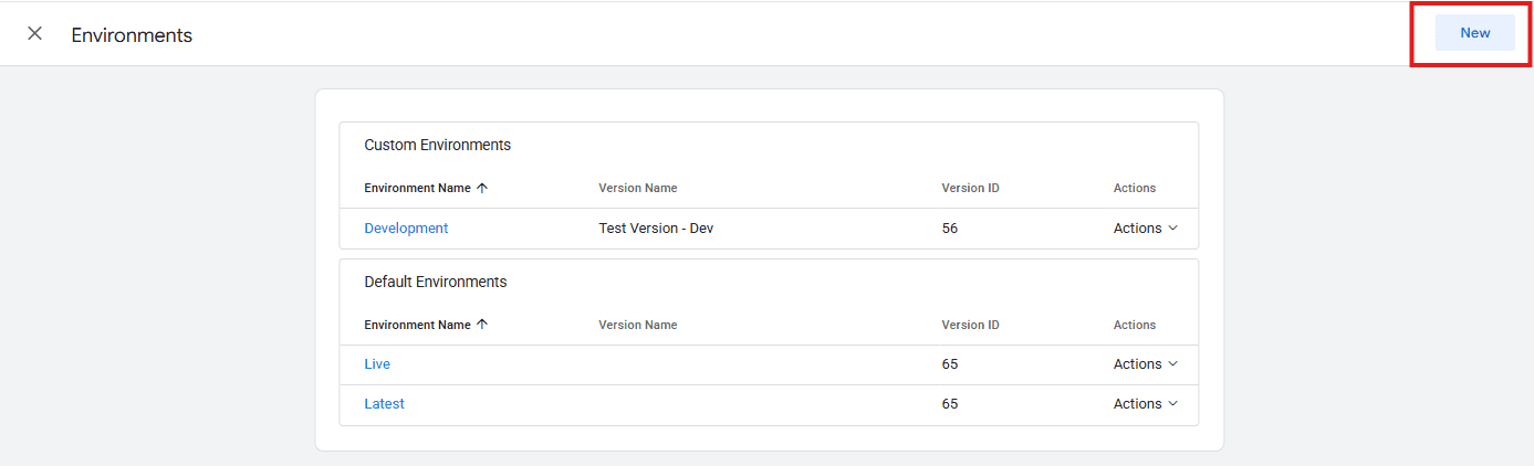 Once inside the “Environments” option, click on the "New” button in the top right corner.