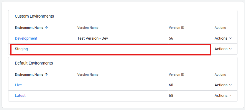 NOTE: You don’t actually need to push a version to this environment. If you click outside of this screen, the list of environments will show with “Version Name” empty/blank. HOWEVER, if you don’t push any version to it, you won’t be able to get the snippet.
